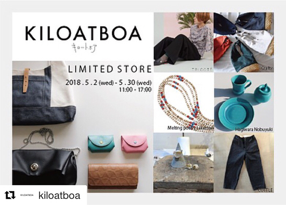 5月の1ヶ月間だけの期間限定SHOPついに開店です。kiloatboaの皮製品は、もちろん新ブランドも発表されます。kiloatboaさんのセレクトしたアイテムを是非お手にとってみて下さい!#Repost @kiloatboa with @get_repost・・・KILOATBOA LIMITED STORE5月の約一ヶ月KILOATBOA STOREがオープン致します「生活に溶け込むアート」をテーマにKILOATBOAオリジナルアイテムから、洋服や器などのセレクトアイテムも並びます是非皆様お出かけください・詳細はこちらのアカウントで紹介して参ります・KILOATBOA LIMITED STORE5/2(wed)-5/30(wed)11:00-17:00筑後市羽犬塚339-1Flower Birdさん2Fお車でお越しの際はFlower Birdさんの駐車場をご利用ください・#kiloatboa#キロートボア#福岡県#筑後市#flowerbird#ggプランツ研究所 greengreen 2018年5月2日 Add Comment