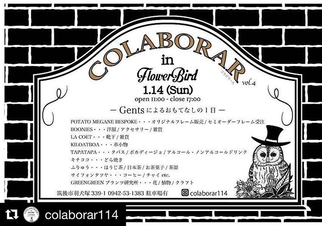 Home » colaborar1月14日開催です変幻自在のイベントでございます!今回は筑後にてありそうで、無かった漢のイベント!#Repost @colaborar114 (@get_repost)・・・みなさんお久しぶりでございます!! 早いものであの、夏の日から約半年、、、コラボラールの第4弾がきまりました! "COLABORAR vol.4"〜Gentsによるおもてなしの一日〜in flowerbird2018.1.14(Sun)open→11:00close→17:00今回は筑後市にあります#flowerbird さんの全面的なバックアップの元開催させていただくはこびとなりました!詳細は随時UPしていきます!要チェック#colaborar#ggプランツ研究所 #flowerbird #花屋