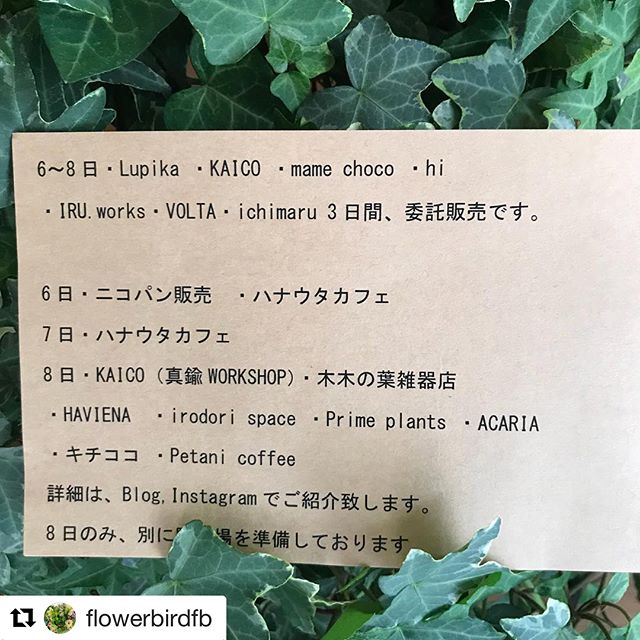 CRAFT ROOM 97月6.7.8日梅雨の真っ最中ですが、見逃せないです!#Repost @flowerbirdfb with @get_repost・・・CRAFT ROOM 9・7/6〜7/8・今回は、GREEN GREENプランツ研究所さんがこの方たちの作品を見て欲しいと、熱望して、実現致しました。初めての方も多くいらっしゃいます。・3日間、Flower Birdの小部屋が、CRAFT ROOMにかわります。・どんな作品が並ぶのか、楽しみにされてくださいませ。・・8日は、スペシャルデーとなっており、たくさんのお店が集まります。日曜日は、駐車場を拡大して、お客様のご来店をお待ちしております。#craftroom9