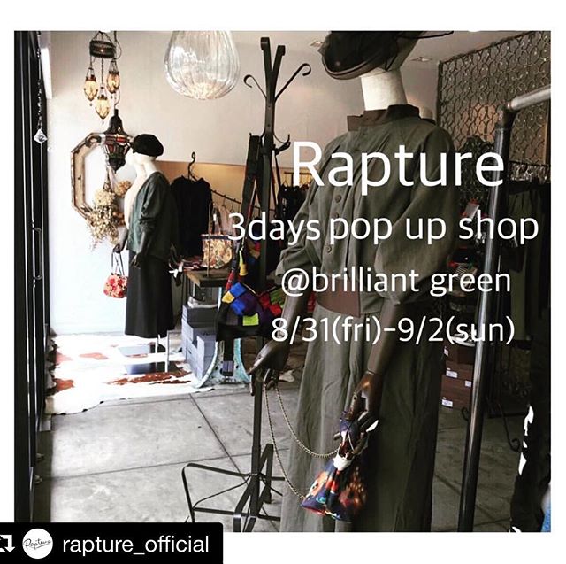 あのRaptureの新作が見れます!そして!あのデザイナーの永尾氏がいらっしゃいます!#Repost @rapture_official with @get_repost・・・★Rapture pop up shopのお知らせ★8/31(金)-9/2(日) @brilliantgreen.aino 福岡県久留米市のbrilliant greenで3day limited pop up shopを開催いたします。秋冬モデルの受注会、また、いまから使いたい秋に向けてのアイテムや、定番のお財布やバッグなどの即売会を致します。当日はRaptureデザイナー永尾智美も店頭で皆様をお待ちしております。..サンプルを全てご覧いただける、またとない機会です。皆さまのお越しをお待ちしております。.brilliant green@brilliantgreen.aino 久留米市東町5-13ミチパールビル1階.8/31(金)-9/2(日)Rapture 3 days pop up shop at Brilliant Green in Kurume, Fukuoka from 31st Aug to 2nd Sep.Meet the Rapture designer Tomomi Nagano will introduce autumn winter collection. All items are available for pre-order or purchase. Limited giveaway gifts are ready for customers purchased on the day.Looking forward to your coming!#rapturebag #rapture #ラプチャーバッグ #ラプチャー#popupshop #brilliantgreen