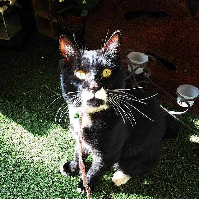 看板猫のトキオ。リードを着けて散歩。ヒゲが長いです。#ネコ #猫