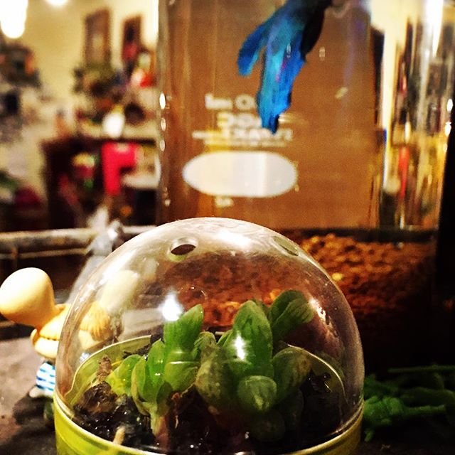 ガチャガチャのカプセルミニテラリウムうしろでベタ泳ぐの図。#GGプランツ研究所 #flowerbird #ガチャガチャ#plants#ハオルチア#ベタ greengreen 2016年11月12日 Add Comment